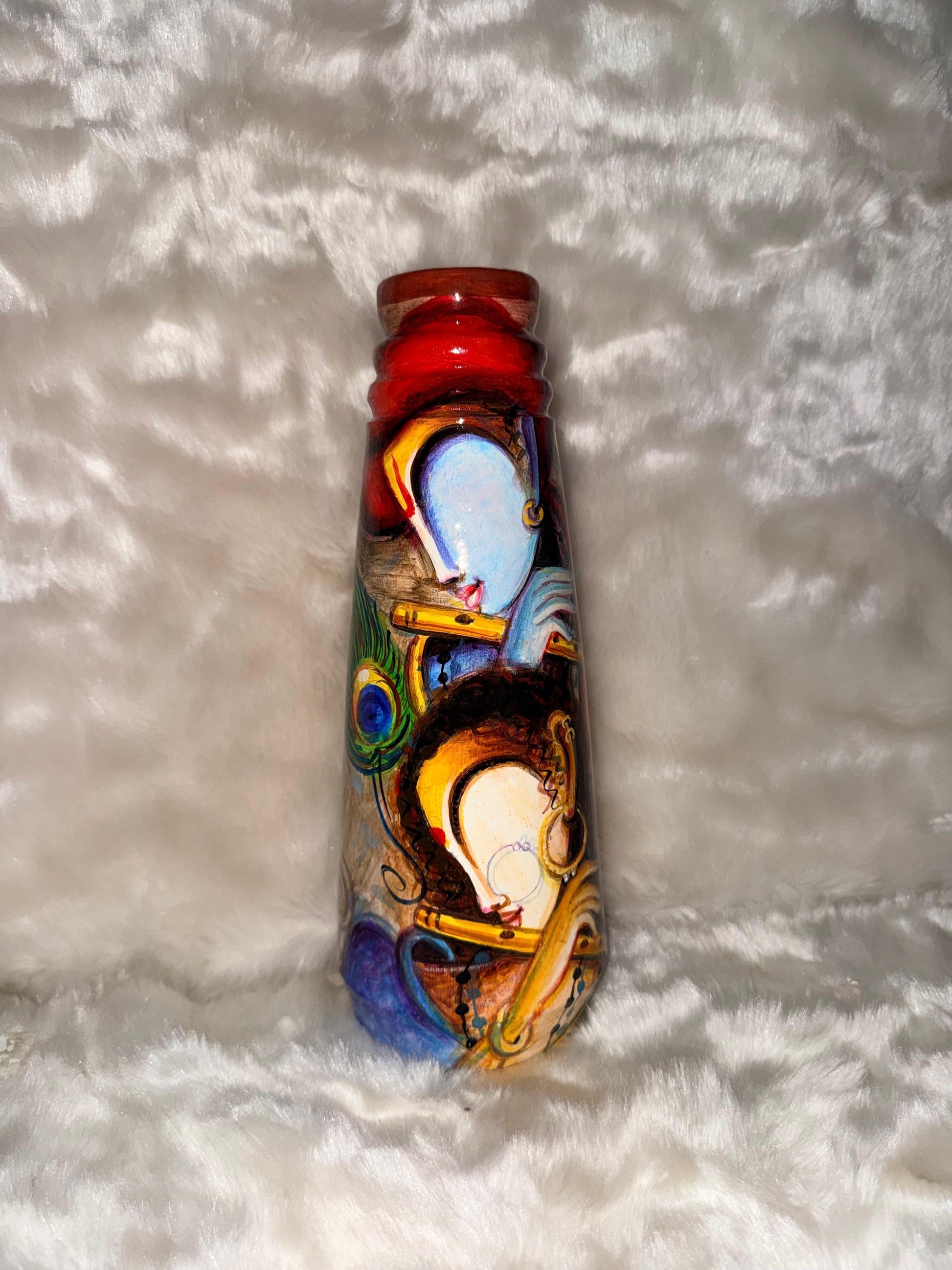 - Hand-Painted Art: This terracotta pot features a unique, hand-painted depiction of two figures, likely Krishna and Radha, playing a flute in a traditional folk art style.